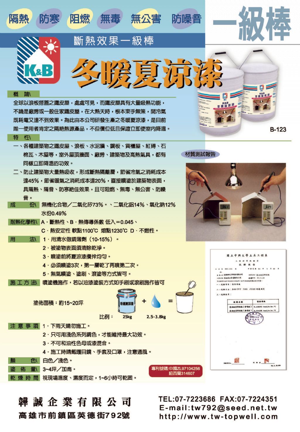 本材料為由無機化合物、二氧化矽、二氧化鋁、氧化鈉所組成、適用於各種建築物之鐵皮屋、浪板、水泥牆、鋼板、貨櫃屋、紅磚、石棉瓦、木屋等,室外屋頂牆面、廠房、建築物,具立即降溫的功效。可防止建築物大量熱吸收,形成斷熱隔離層,節省冷氣之消耗成本達45%,節省暖氣之消耗成本達20%。直接噴塗於建築物表面, 具隔熱、防寒絕佳效果,且可阻燃、無毒、無公害。