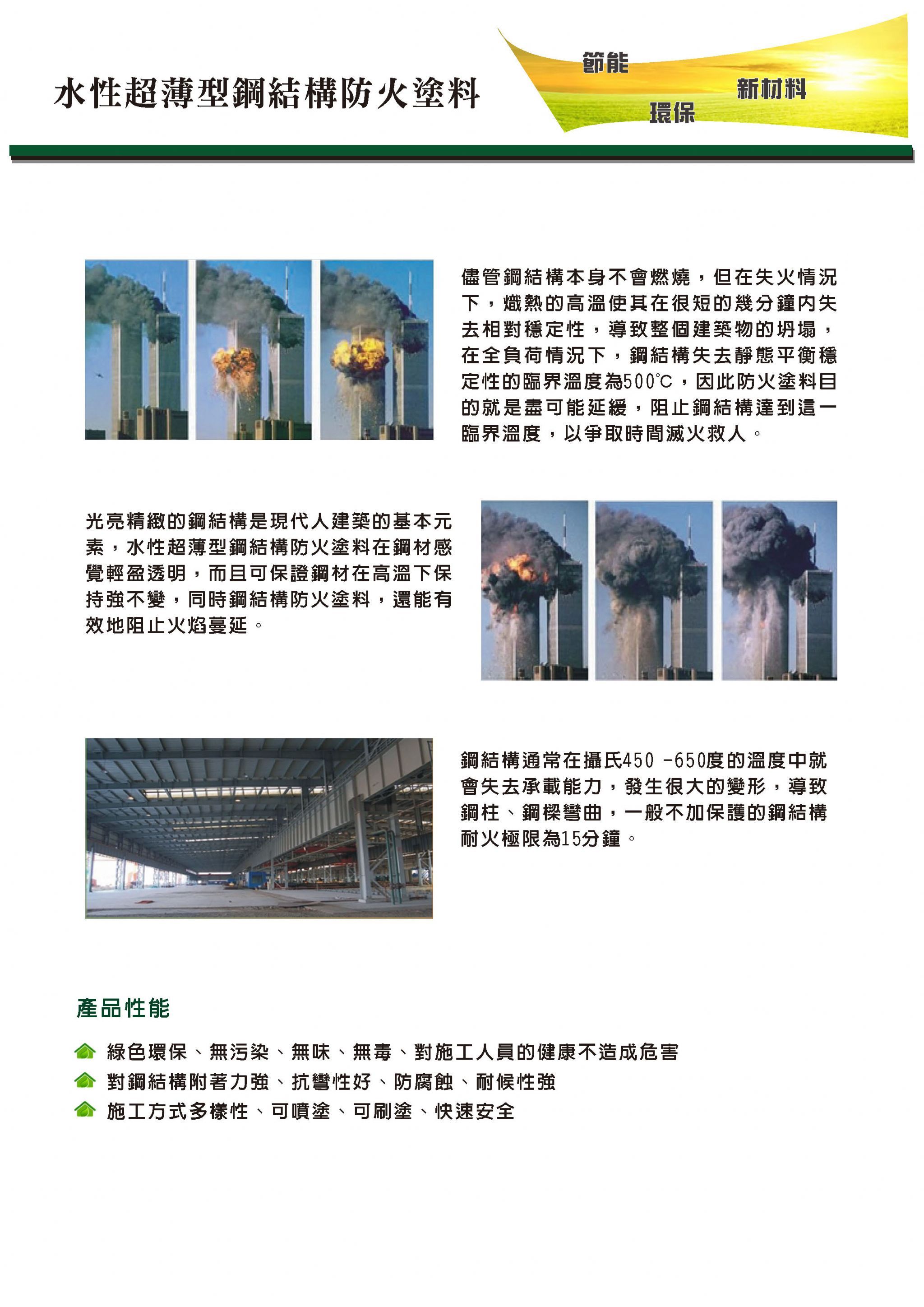 儘管鋼結構本身不會燃燒,但在失火情況下,熾熱的高溫使其在很短的幾分鐘內失去相對穩定性,導致整個建築物的坍塌,在全負荷情況下,鋼結構失去靜態平衡穩定性的臨界溫度為500℃,因此防火塗料目的就是盡可能延緩,阻止鋼結構達到這一臨界溫度,以爭取時間滅火救人。光亮精緻的鋼結構是現代人建築的基本元素,水性超薄型鋼結構防火塗料在鋼材感覺輕盈透明,而且可保證鋼材在高溫下保持強不變,同時鋼結構防火塗料,還能有效地阻止火焰蔓延。鋼結構通常在攝氏450 -650度的溫度中就會失去承載能力,發生很大的變形,導致鋼柱、鋼樑彎曲,一般不加保護的鋼結構耐火極限為15分鐘。
